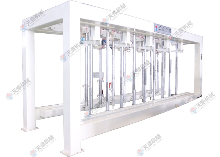 切割機(jī)中間位置停止后,由小車置換裝置將側(cè)板連同坯體抬起,切割小車退回翻轉(zhuǎn)行車底下進(jìn)行下一次承載脫模后的坯體,另外一部切割小車