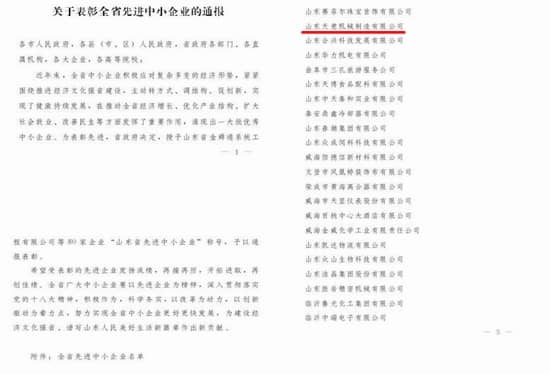 賀:山東天意機(jī)械股份有限公司被省政府評為全省先進(jìn)中小企業(yè)!
