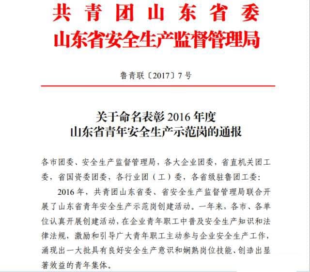 為激勵引導全省廣大青年職工強化安全生產(chǎn)意識,提高安全生產(chǎn)技能,參與安全生產(chǎn)管理,2016年共青團山東省委、山東省安全生產(chǎn)監(jiān)督管理局聯(lián)合開展了山東省青年安全生產(chǎn)示范崗創(chuàng)建活動。山東天意機械股份有限公司新產(chǎn)品班組榮獲2016年度“山東省青年安全生產(chǎn)示范崗”